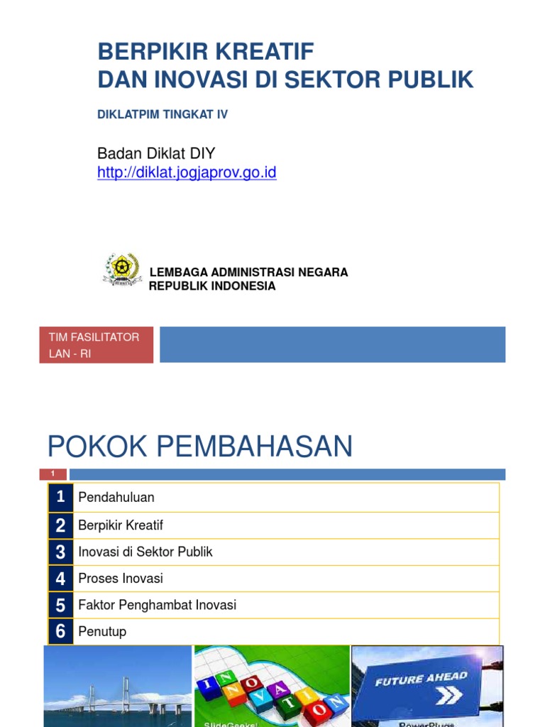 Inovasi Sektor Publik Untuk RLA from image.slidesharecdn.com Sebagai sebuah buku teks, desain buku ini lebih ditujukan untuk pengguna mahasiswa, khususnya yang mengambil mata kuliah difusi inovasi dalam pemerintahan di stia lan. 23 manfaat inovasi sektor publik manfaat inovasi sektor public megejar ketertinggalan kemajuan ilmu teknologi meningkatkan 37 contoh inovasi kualitas pelayanan publik bank sampah kota malang & kota bandung inovasi open house tiap rabu bersama wali kota tangerang selatan. 'smart city' saat ini menjamur di seluruh dunia. 1 x 45 manajemen perubahan menit. Inovasi sektor publik materi diklat reform leader academy untuk membangun satu pemerintahan dr. Ambil contoh saja prosesnya yang ribet, belum lagi tidak adanya transparansi serta akuntabilitasnya yang dipertanyakan. Menurut anda mengapa banyak pembisnis menyukai resiko ? Lembaga administrasi negara (lan) sebagai salah satu lembaga pemerintah non kementerian yang beberapa tahun belakangan ini gencar mendorong inovasi disektor publik, yaitu dengan memasukkan proyek perubahan kedalam kurikulum diklat.